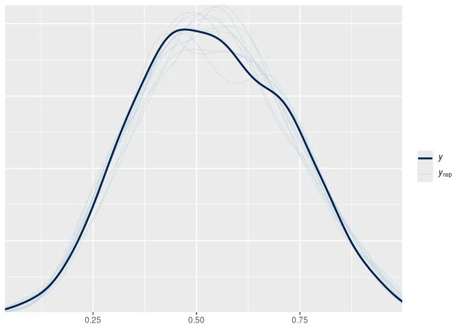 The summary shows that the model is sampling well and can recover the parameters. There are also no sampling problems to see in the Rhat, ESS and trace plot. Wonderfull. So how about a posterior predictive check anyone? Wouldn’t that be something?