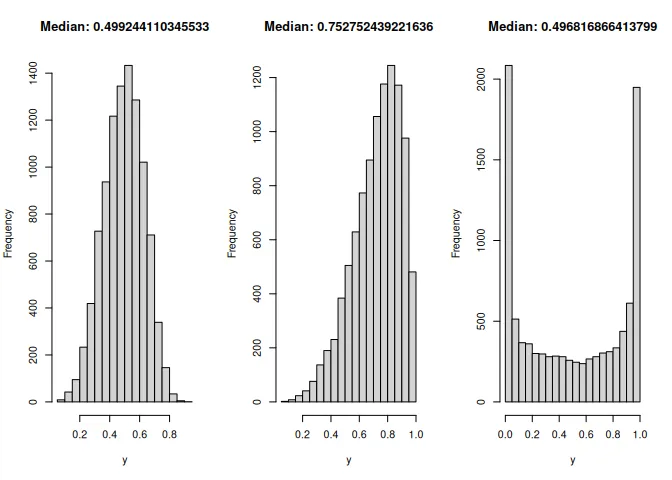 y = rkumaraswamy(10000, mu = 0.5, p = 0.25)